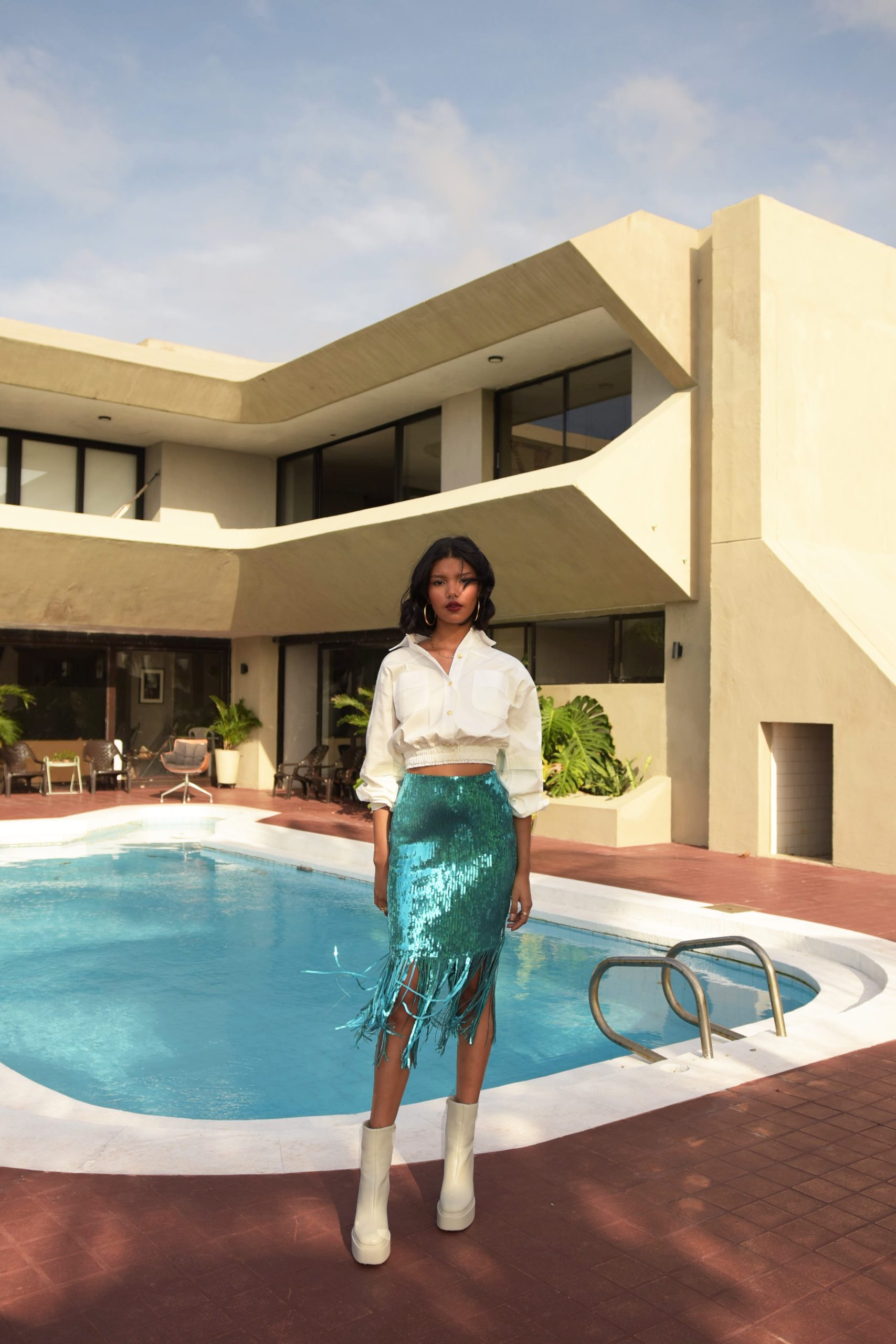 Una falda brillante y llamativa de flecos con lentejuelas, con una horma ajustada al cuerpo y corredera invisible en la parte posterior. Combínalo con un top elegante de seda y tacones para un look de fiesta o un top casual de algodón y tennis para un look deportivo pero chic!
