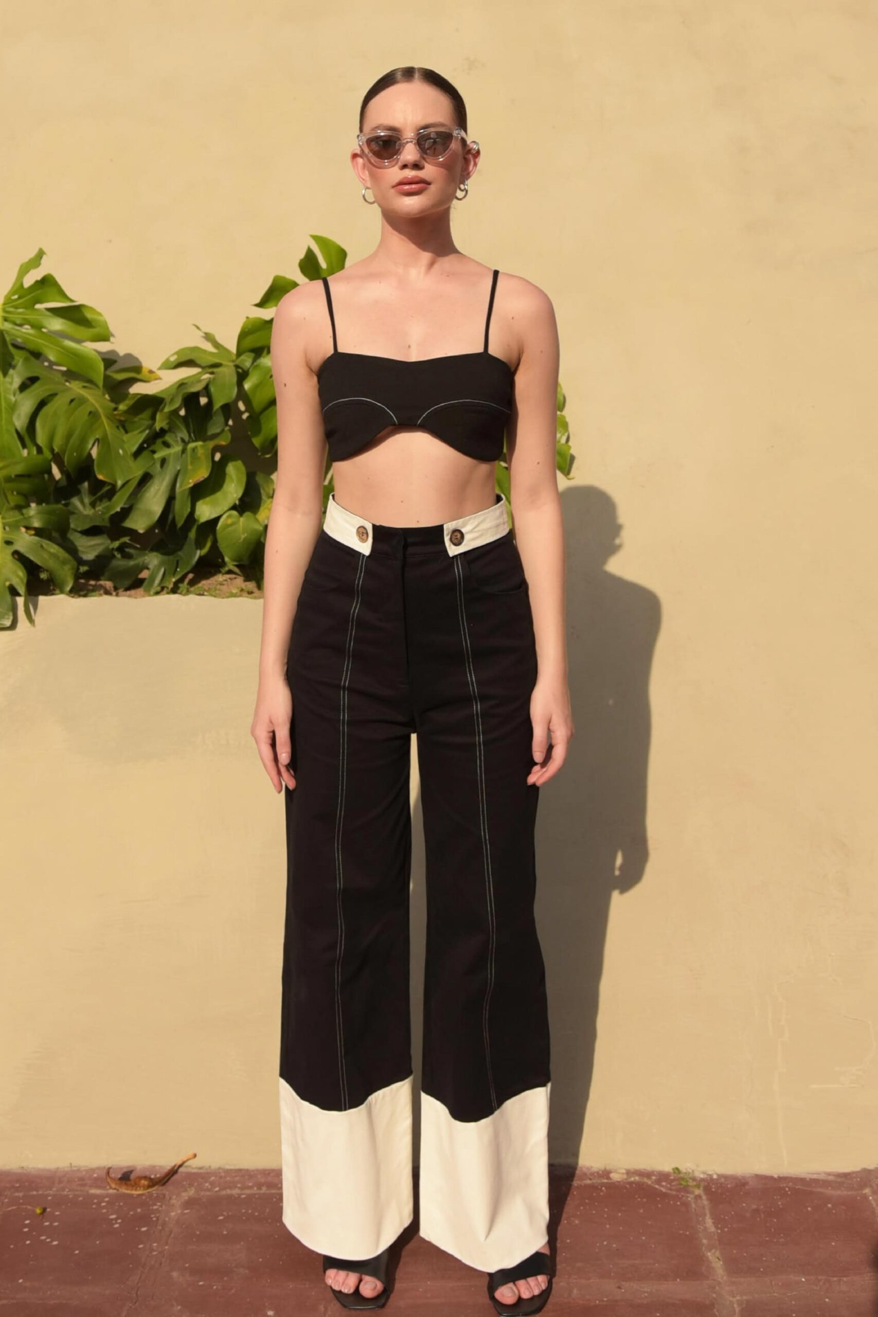 El top Joan es un básico minimalista esencial, con un escote curvo y cortes, pespuntes blancos, corredera desprendible en la espalda, y reguladores en las tiras. Hecho con una tela stretch pero gruesa, perfecta para hormar el busto idealmente.