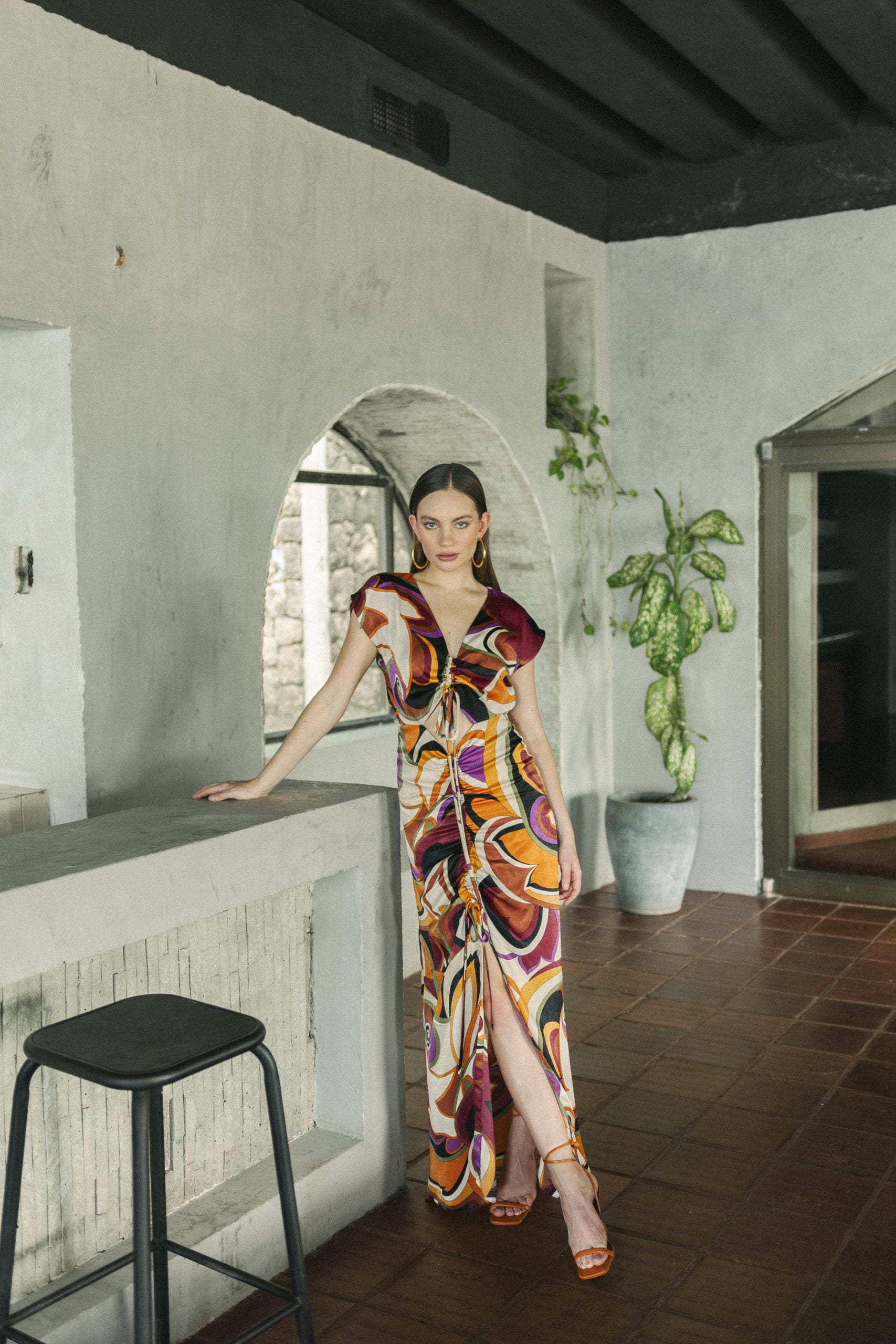Un delicado vestido largo manga corrida con abertura frontal, falda ligeramente acampanada, detalles fruncidos en el frente, y una espalda abierta. Viene con una corredera invisible en la falda posterior y nuestro botón dorado insignia para asegurar el top. Se puede ajustar a tu gusto, disfruta la fluidez de la tela al moverse. Perfecto para transición de día a noche con solo un cambio de zapatos.