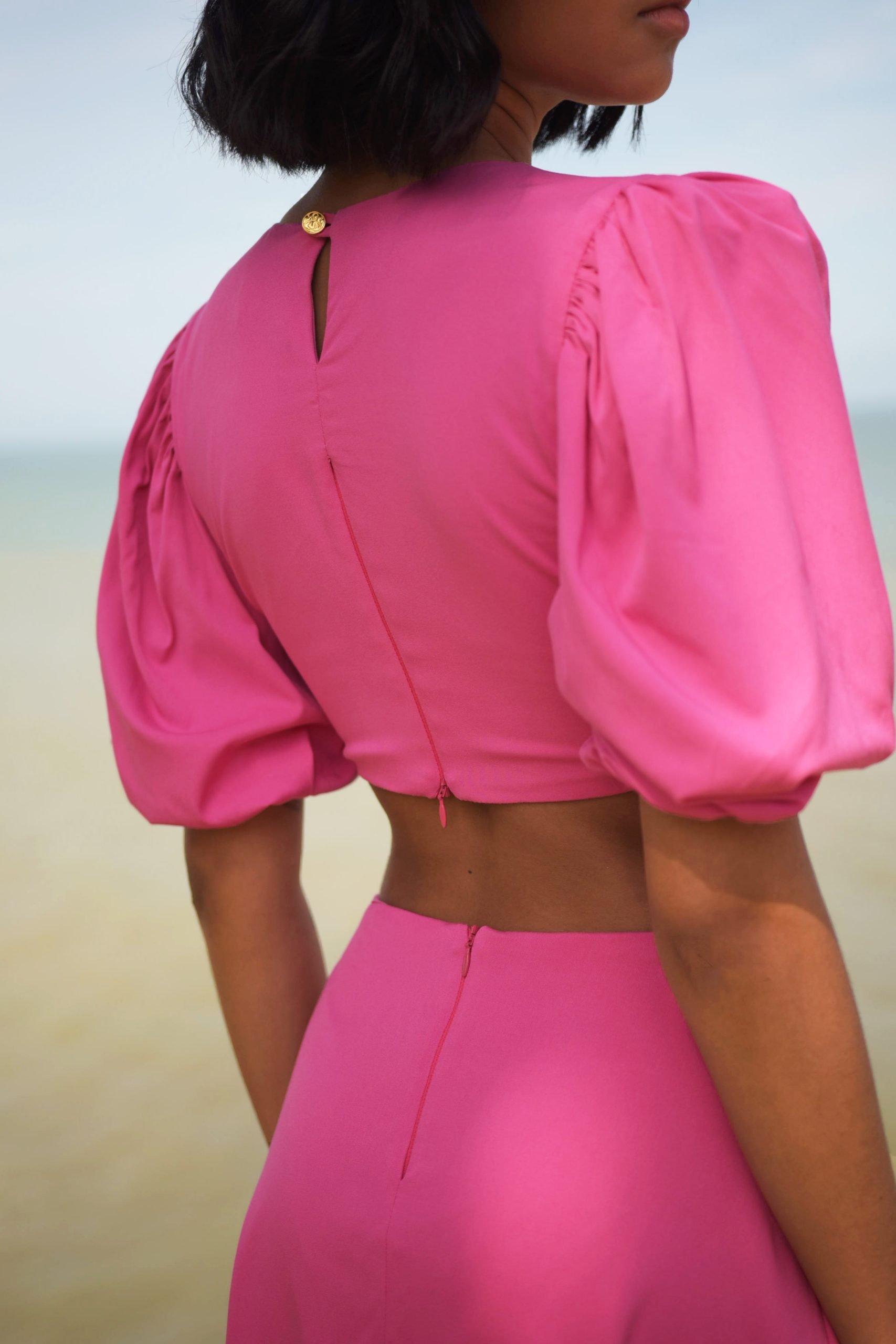 Vestido de mangas bombachas, con cortes para acentuar la cintura, nudo en el frente, y falda acampanada. Viene con corredera invisible en la falda posterior y nuestro botón insignia dorado para asegurar el top. Hecho de Rayón suave, perfecto para un evento de día.